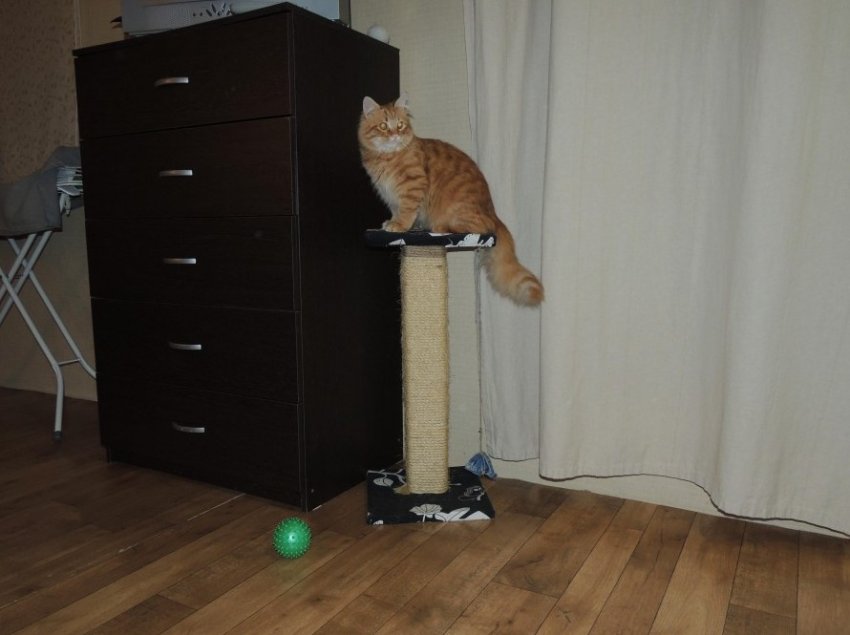 Размеры нашего котяры исключают возможность приобретения стандартной когтеточки, поэтому соорудили её сами, из подручных материалов (сломанная табуретка и брусок).