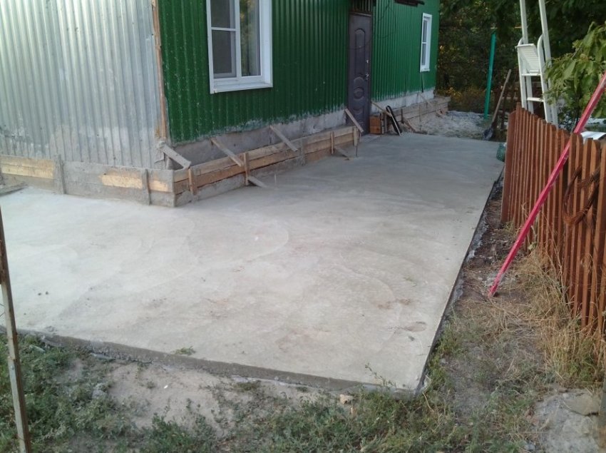 Первое, что с удовольствием убрали — ужасную бетонную ленту вокруг дома, которую сами же и создали не иначе в состоянии умопомрачения. На дополнительный фундамент для кирпичной кладки, опирающийся на ту самую спорную плиту, что держит весь дом, и на вот эту площадку ушло пять кубов бетона, и 32 тыс. рублей вместе с оплатой работы.