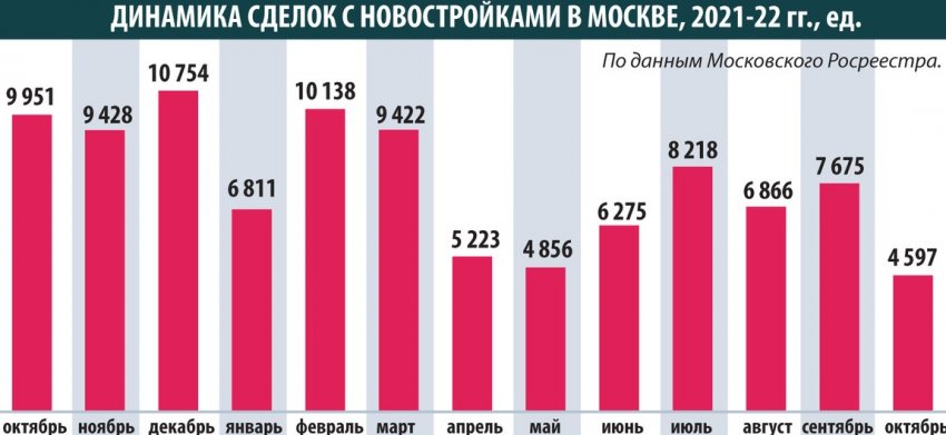 В октябре участники долевого строительства, по данным Росреестра Москвы, заключили в столице 4,6 тыс. договоров долевого участия (ДДУ), что на 40% меньше, чем в сентябре, когда было зарегистрировано 7,7 тыс. ДДУ. По сравнению с октябрем 2021 года число сделок упало на 54%.
