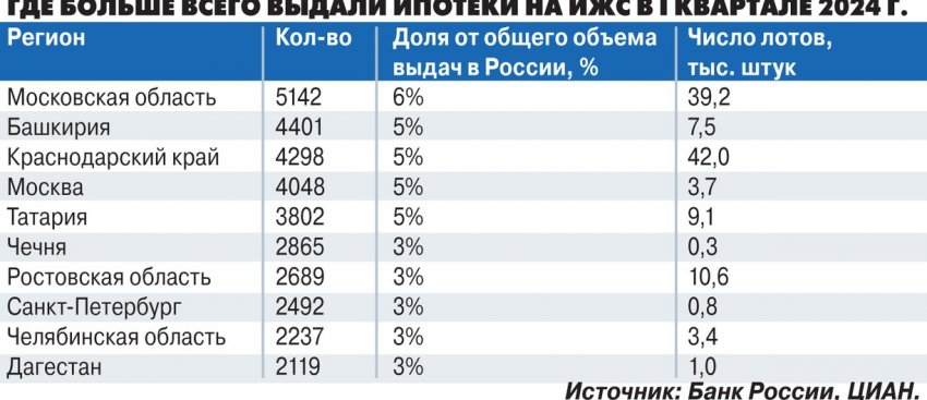Самые высокие показатели доли ипотеки на ИЖС в I квартале зафиксированы в республиках Северного Кавказа и юга Сибири с высокой долей сельского населения — от 44% до 69%, отметили аналитики. Так, доля ипотеки в ИЖС в Чечне выросла до 89%, в Ингушетии (77%), Дагестане (66%), Тыве (58%), Карачаево-Черкесии (56%), Республике Алтай (53%).